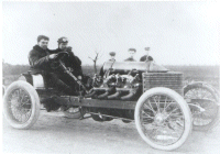 This site documents the rebuilding of this historic and unique car during the latter half of 2005 in time for its 100th birthday, and the anniversary of its successful attack on the World Land Speed record. During 2006 it was fired up and driven a number of times. The above is a photo of the car waiting to make its run in 1905, notice the dirt road surface and a picture from the archives showing these brave men in action on 30th December 1905.