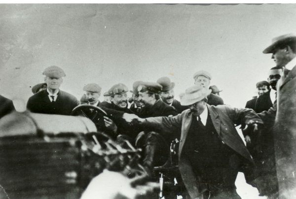 | A lovely period shots of the motoring heroes, above are Hemery and Demogeot, on the sands at Daytona getting ready, and below are the victorious Demogeot and Vivet, they can hardly believe their good fortune |